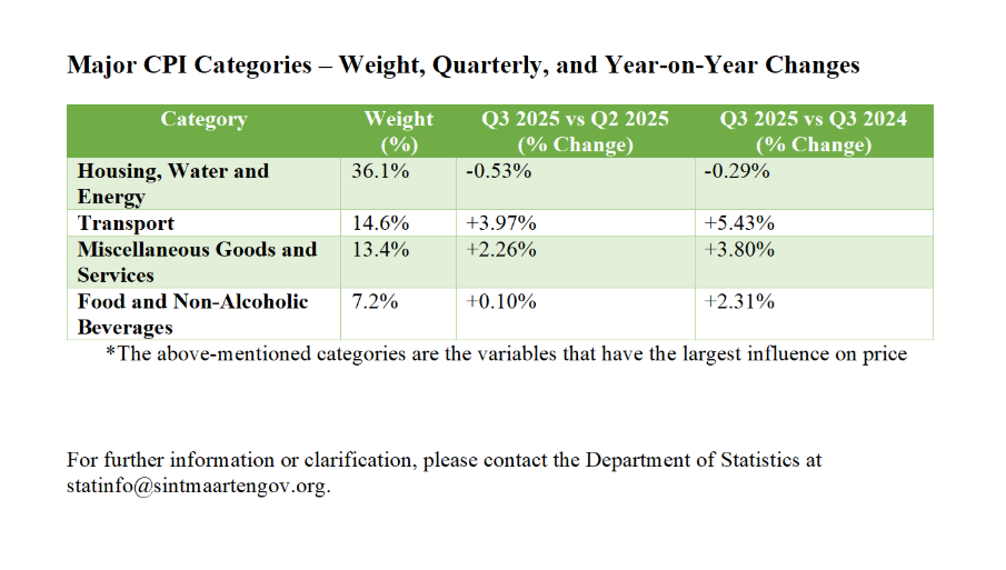 In Q3 2025, the CPI inflation increased by 1.12% compared to the same quarter of 2024. The CPI shows that movements across four (4) key expenditure categories were as follows: