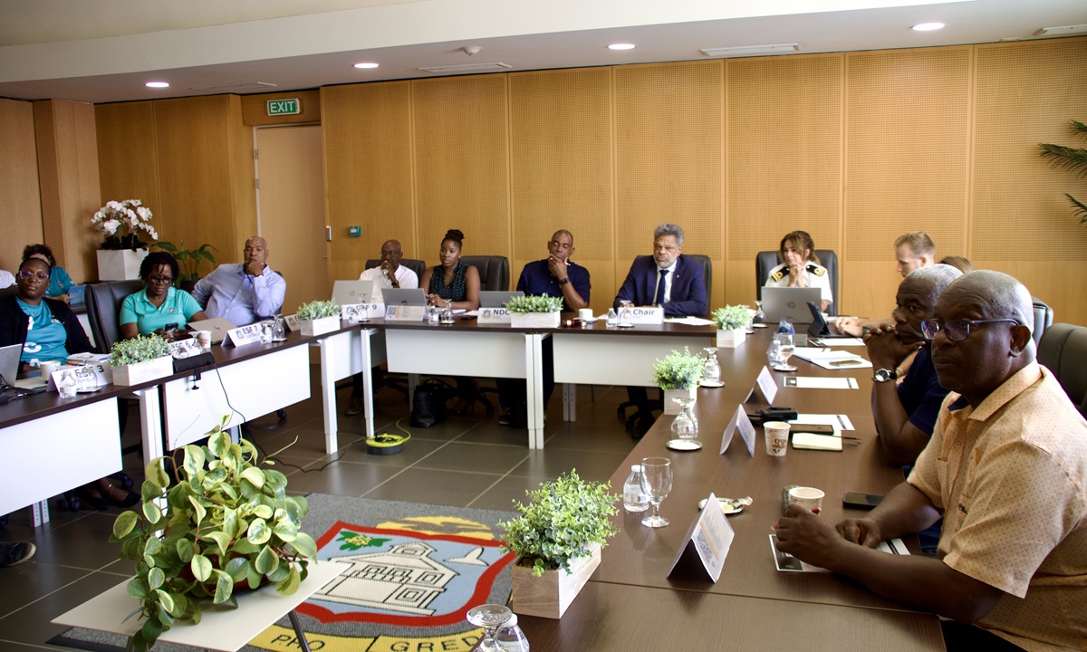 Chairman of the Emergency Operations Center (EOC) Prime Minister Hon. Dr. Luc Mercelina (2nd from right seated at the head of the table) along with the representatives of the 10 Emergency Support Functions (ESFs) as well other stakeholders viewing Hurricane Erin on the screen while the Meteorological Department of Sint Maarten briefs the EOC. (Photo DCOMM)
