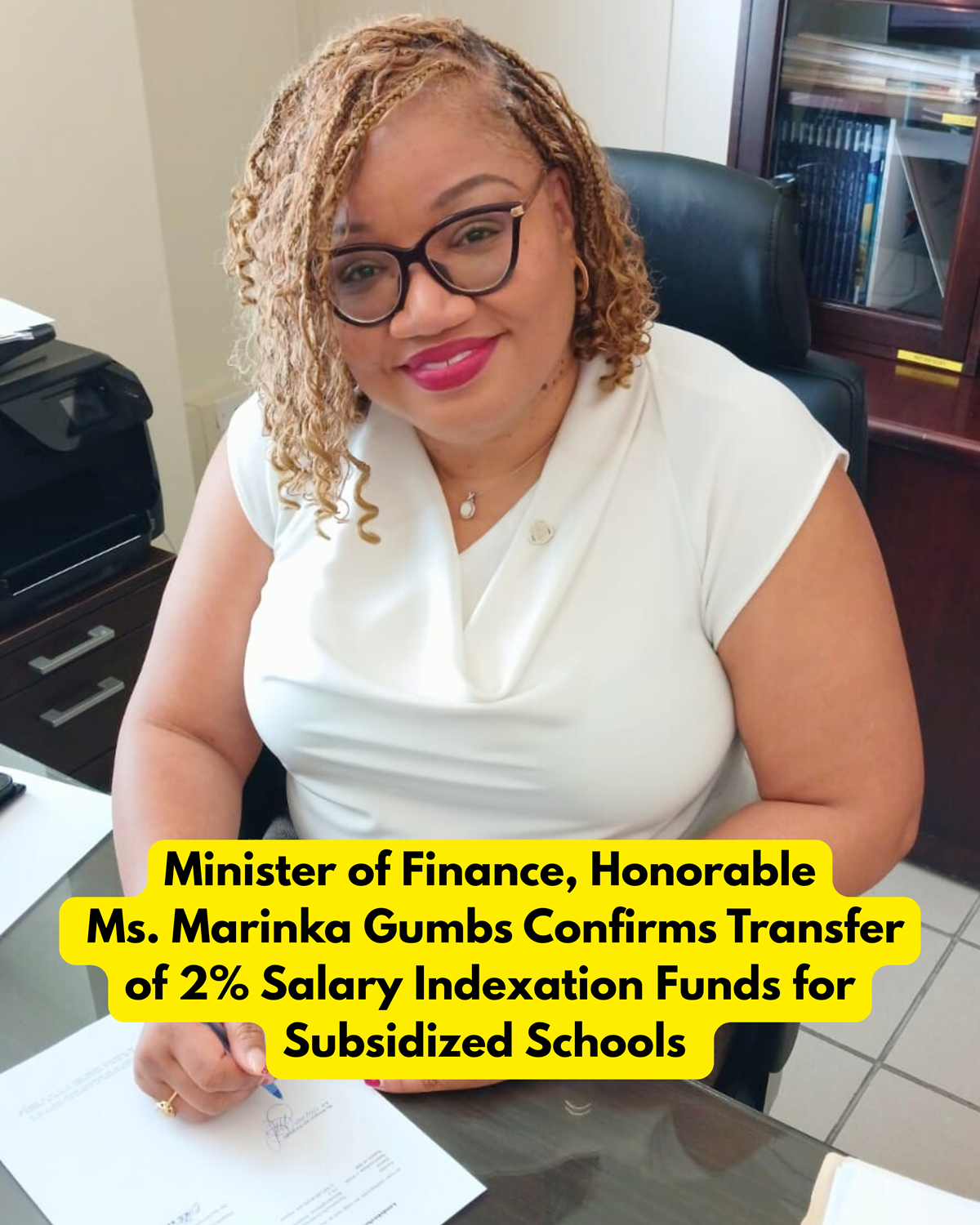 The Minister of Finance, Marinka J. Gumbs, announces that the 2% salary indexation funds for teachers in subsidized schools have been transferred to the subsidized schools on Friday, September 5, 2025.