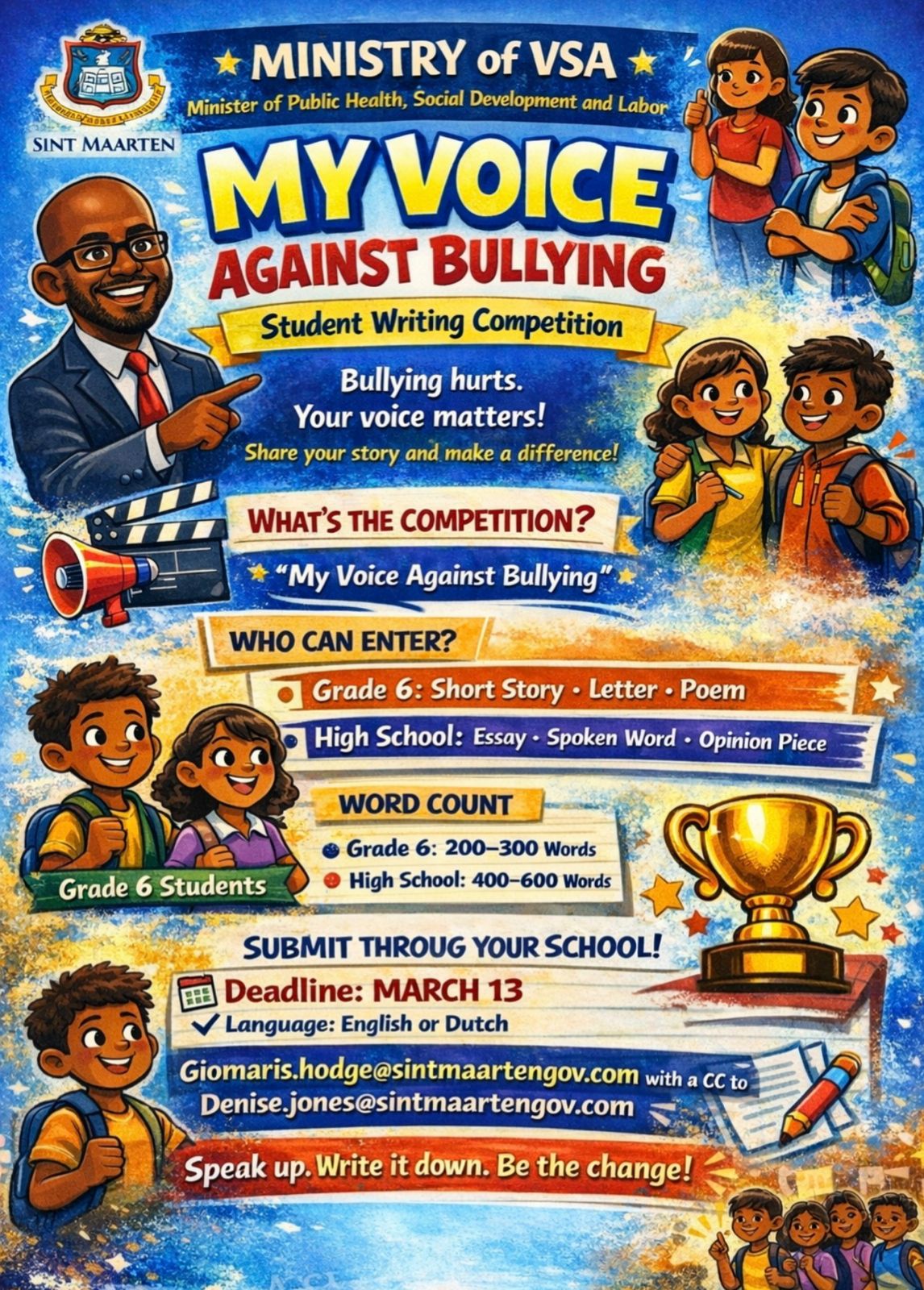 Philipsburg, Sint Maarten — The Minister of Public Health, Social Development and Labor (VSA) has officially launched his 2026 nationwide Anti-Bullying and Youth Mental Health Awareness Campaign, aimed at promoting safe, inclusive, and supportive school environments across Sint Maarten.