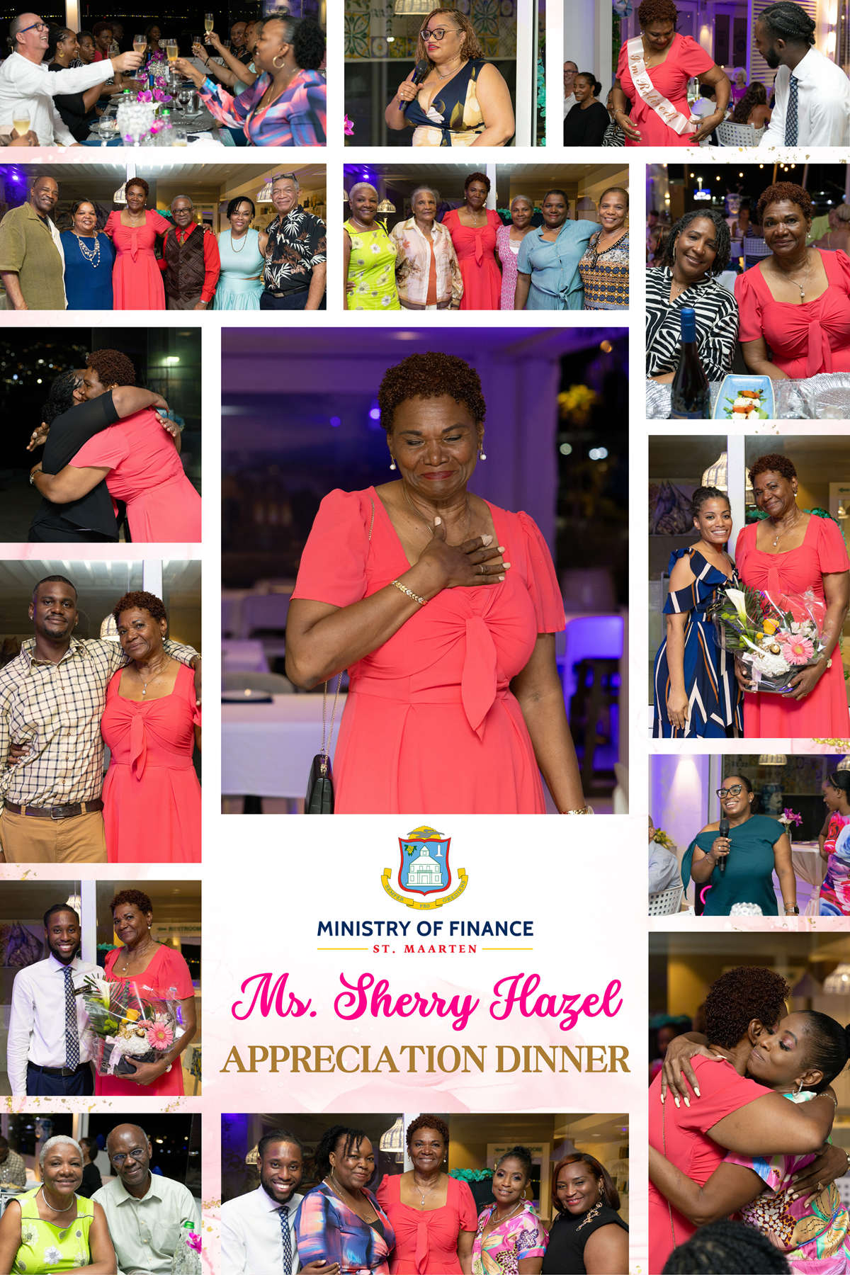 The Minister of Finance, the honorable Marinka Gumbs, together with colleagues, family and ex-colleagues in government, proudly honored Ms. Sherry Hazel during an appreciation dinner held in recognition of her exceptional service to the Government of Sint Maarten.