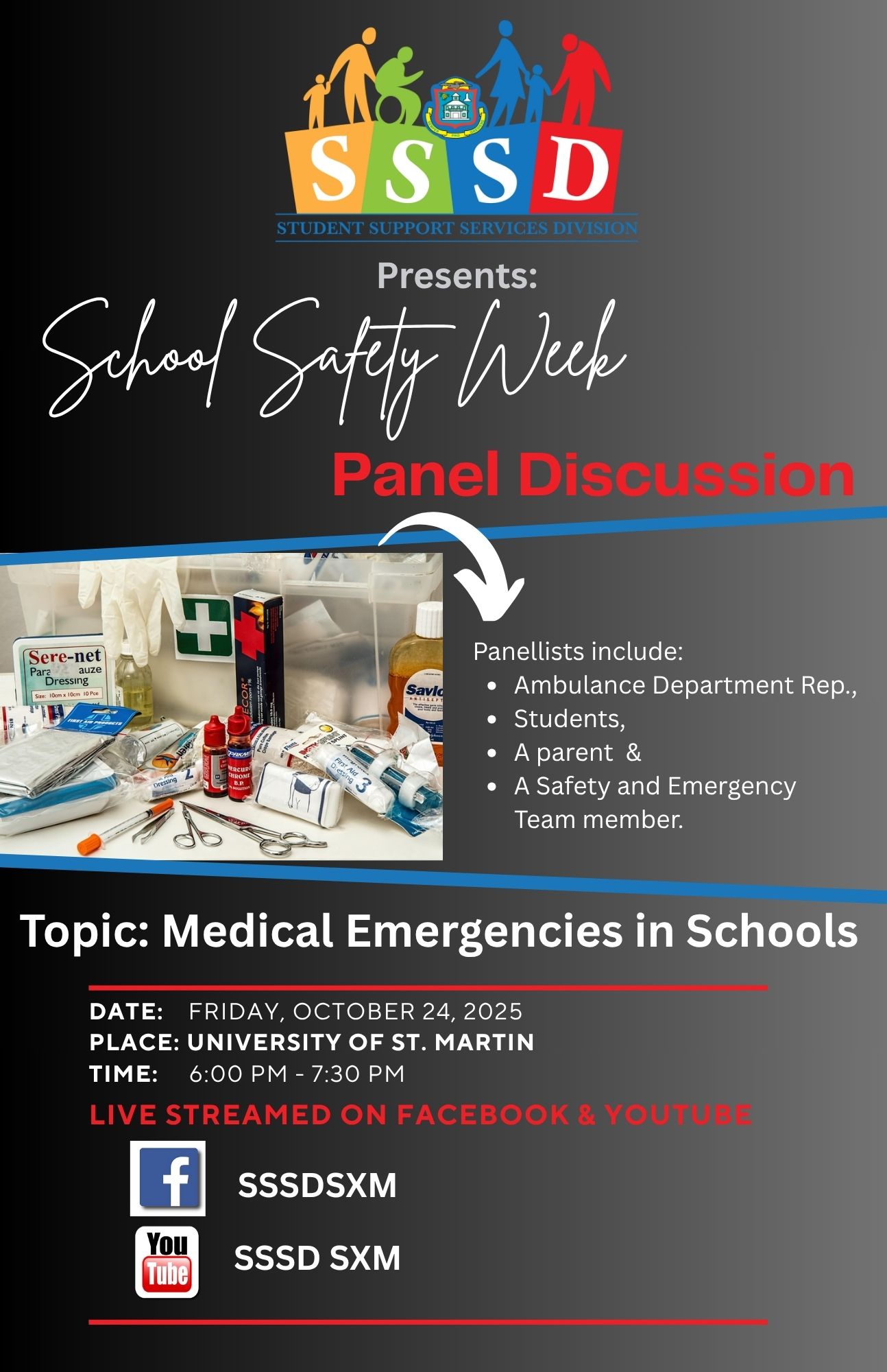 The panel discussion will focus on medical emergencies in schools and will be live streamed via the Facebook and YouTube pages of the Student Support Services Division. This event is part of SSSD’s School Safety week activities.